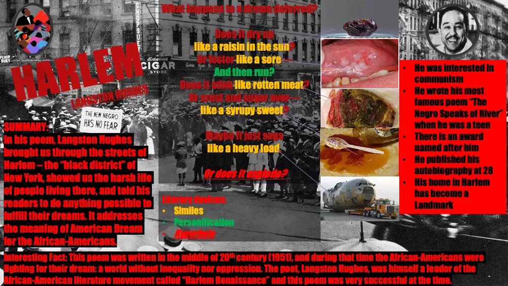 老师评语:“Harlem”是一首强有力的诗,赵于果同学在阐释其强有力的信息方面做得很好。他决定选择黑色和红色等强烈的颜色来更好地表达信息。虽然可以通过减少红色的数量来进行一些改进,但总的来说它是一张叙事有力的海报。他的总结写得很好,并且对这首诗的主题进行了恰当的解释。他的作品很少有错误。此外,他在作者介绍中加入了非常连贯且重要的事实,更好地帮助观众去了解作者和这首诗背后的背景以及有关这首诗的其他事实。文学分析是通过使用不同的颜色去代表了三种修辞手法来完成的。此外,他还添加了一些图像来帮助读者理解复杂的词汇。