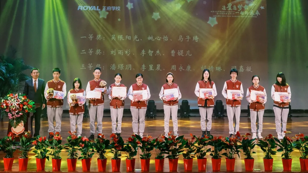 ▲北京王府学校教导处主任洪传木、高一年级主任周梦颖、校学生会主席甘嘉欣同学为201-2022学年度进步之星颁奖