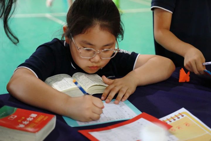 第一道关卡,学生们需要跑过障碍物,记住卡片上的句子,然后返回并写在纸上,如果中途忘记则需再次返回并重新记忆词卡上的内容。这一关主要考察孩子们对英语句子及英语书写的掌握情况,看!孩子们轻轻松松完成关卡!