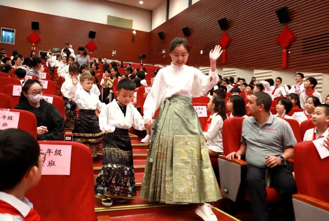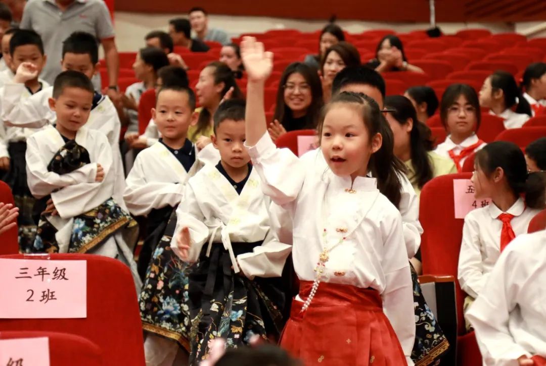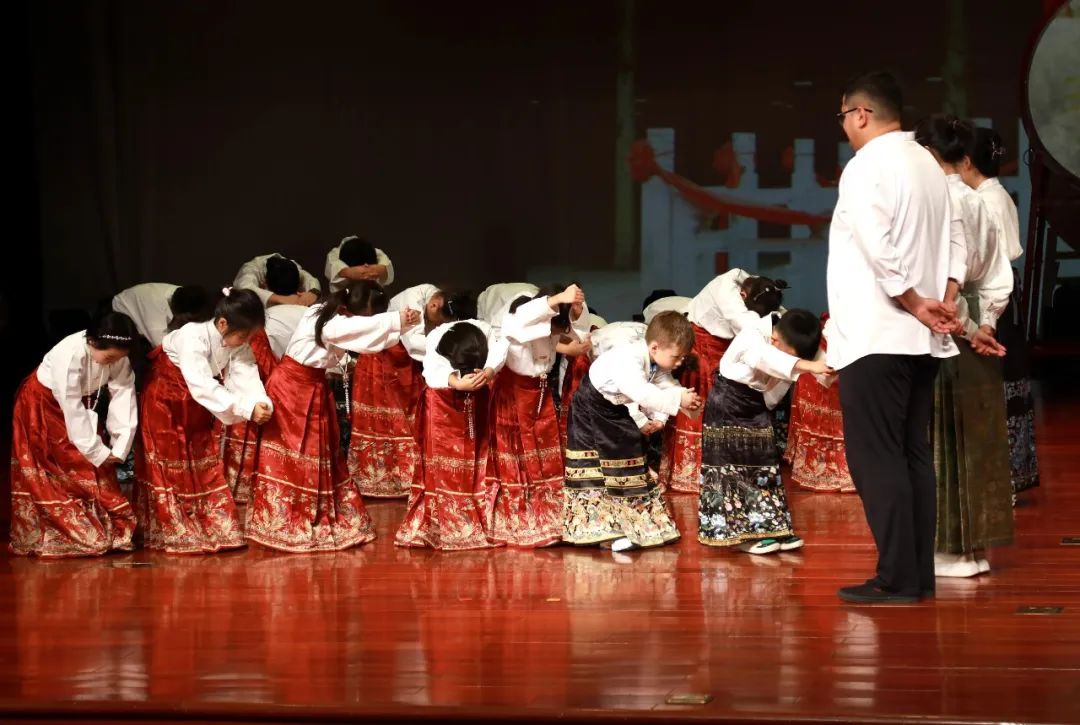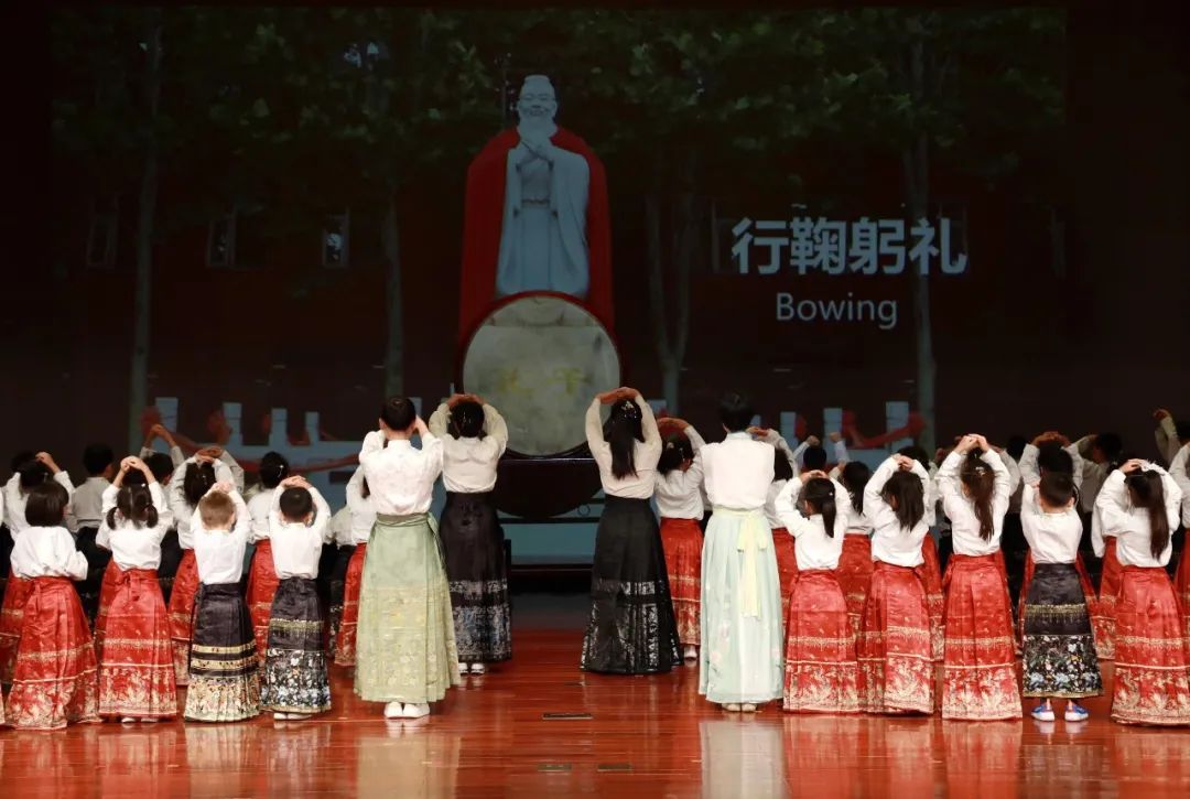 一年级新生身着中国传统服饰的马面裙,在正衣冠——向老师行鞠躬礼——朱砂启智——击鼓明志——描红开笔的开笔礼环节中,感受自古代传承至今的儿童入学启蒙仪式。