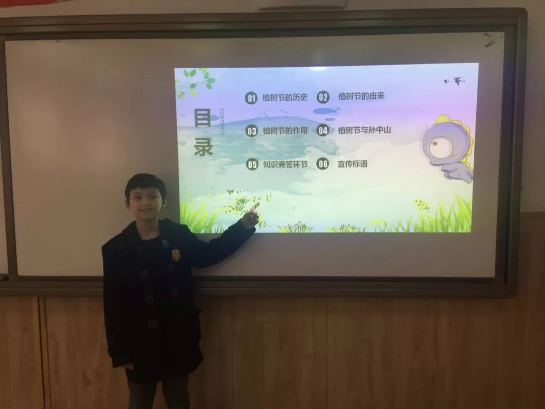 各班的小主持人首先介绍了植树节的由来、发展,以及植树节与其它节日的不同之处。有的班级播放了与植树节相关的宣传片,孩子们全神贯注地观看;有的班级齐诵环保诗歌,把植树造林、美化环境的意识深深地记在了心里。大家从中明白了植树和环保的意义,还知道了不同国家植树节的日期,就连战火不断的国家也有植树节哩!