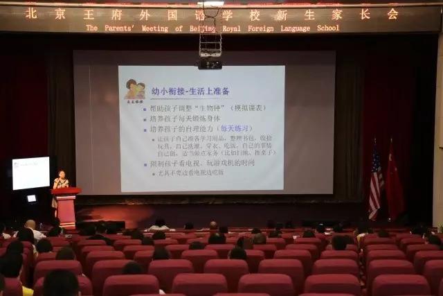 7月17日上午,北京王府外国语学校国际会议中心内,一百余位家长朋友汇集在一起,参加了新小一学生家长会。 参会的家长们,绝大多数都即将成为小学生的父母。孩子面临着幼升小的过渡阶段,其实,家长们也是一样面临许多新挑战。 本次家长会上,校方特别邀请儿童教育专家王宏女士,为新生家长带来了一堂主题为《幼小衔接之如何培养孩子的好习惯》的教育讲座。讲座伊始,王宏女士就用有趣的互动游戏,向家长们说明了什么是“教”与“学”。 在一个半小时的讲座中,王宏女士用生动的例子、家长们即将面临的各类问题,给出了专业的教育分析和解决办法,台下的家长们,听得津津有味,不时做下笔记,看起来都是意犹未尽、收获颇丰。 培养好的习惯,将会影响孩子的一生。而好习惯的养成,需要家长、校方互相配合、共同努力。 专家讲座结束后,王府外国语小学校长任文茹女士和主管教学的边静副校长,也分别登台与家长们分享了对于小一新生行为习惯养成的重要性的理解和感悟。 为了让新小一的孩子们,更好适应小学阶段的学习和生活,王府外国语小学将在8月15日至25日,举办“好习惯早养成”新小一学生夏令营。教导处李立主任详细介绍了夏令营的举办意义、日程安排等,家长会后,已经有很多家庭当即决定为孩子报名! 家校同行,一起牵着孩子的小手,送她/他平稳、快乐地步入小学生活的轨道上。让孩子成才的第一步,从培养孩子正确的行为习惯开始吧!