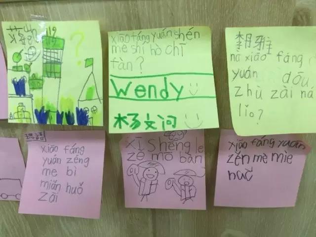同学们的问题五花八门,因为他们个个是充满好奇心和求知欲的小小探究者。没关系,问题多了,我们就用自己的方式记下来,这也是我们从小学习的一种好习惯。可是,消防员叔叔你们能看懂吗?