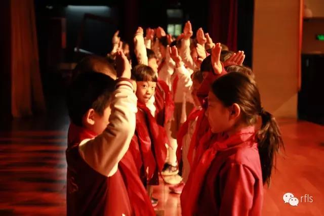 出队旗、唱队歌、阅读入队申请书,已经入队的高年级学长、学姐们为他们戴上红领巾。学生们神情肃穆,在火红的队旗下庄严宣誓:“我是一名少先队员,我在队旗下宣誓:热爱中国共产党,热爱祖国,热爱人民,好好学习,好好锻炼,时刻准备为共产主义事业贡献力量!”