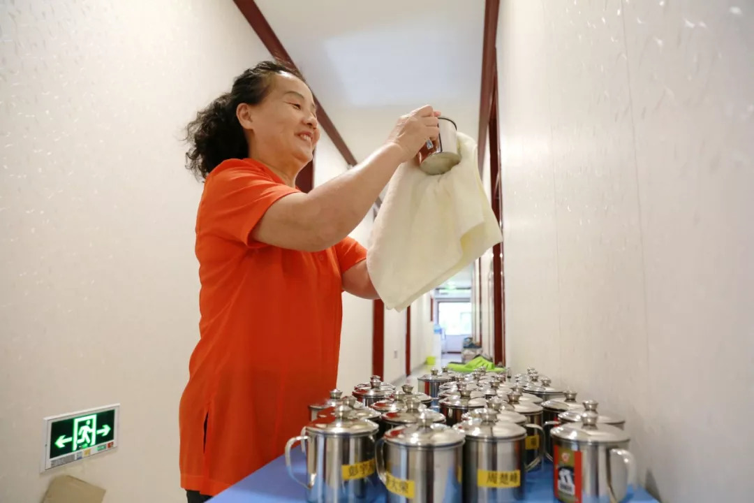 早晨6点多,导育老师已经起床上岗,照顾学生晨起洗漱,带到餐厅用早餐。孩子们去教室上课,导育老师们再次回到宿舍打扫卫生、整理床品。从清晨一直忙碌到晚寝熄灯,个个“小陀螺”一般。新入学的小豆包刚刚住宿,不适应没有妈妈陪伴的夜晚,生活老师便成了孩子们的“在校妈妈”,他们的怀抱是孩子们的安心和温暖。千余名学生的宿舍区用品,大到被子、小到水杯,山一样的物资领取和发放、清洁,每个孩子的十几样物品,都由导育妈妈细心贴上名字。