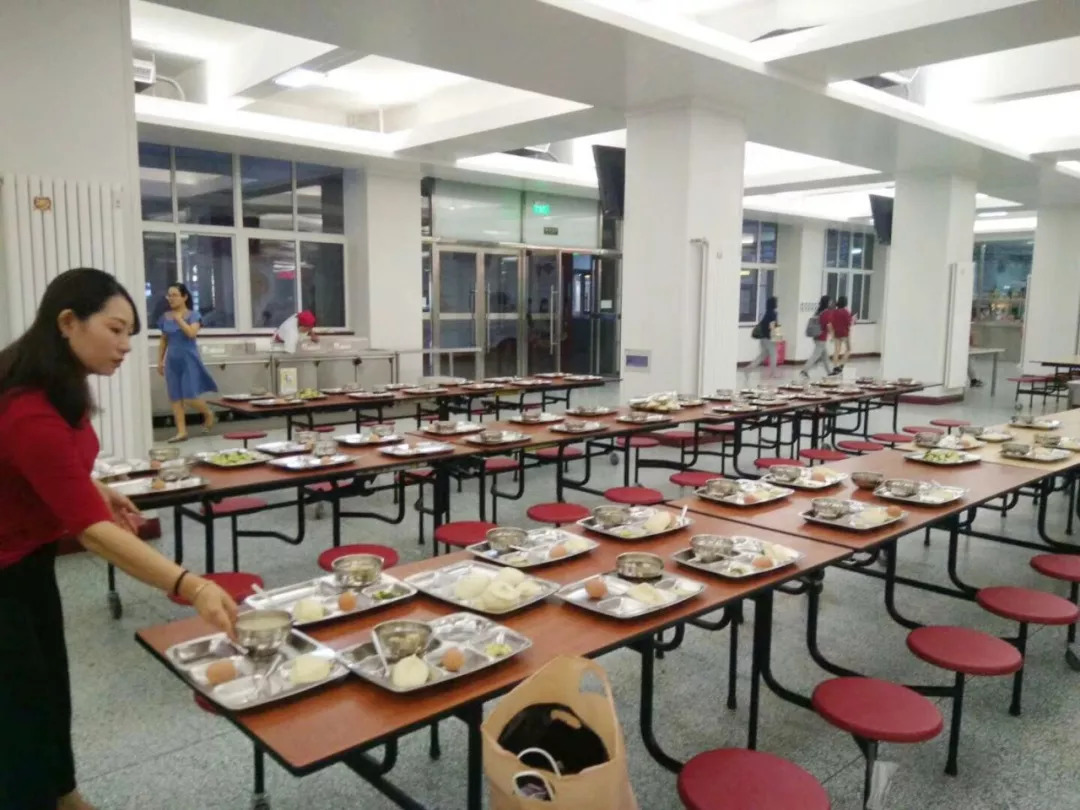 ▲幼小部的孩子们年龄小,端餐盘不太稳,导育老师们算着时间,提前分餐