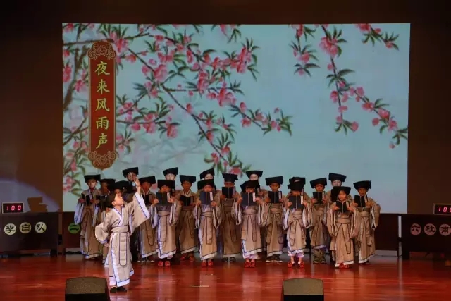 斗诗会不仅有吟诗还有唱诗,轻松悦动的现代音乐和着古风古韵的诗句,师生联唱,别有一番风味,让人不禁惊叹中国诗词跨时空的韵律魅力。无论是配上琵琶、古琴吟诵,还是和着动感、现代的音乐,都是一样的优美动听、久久不绝于耳。
