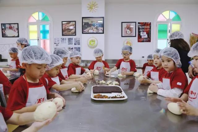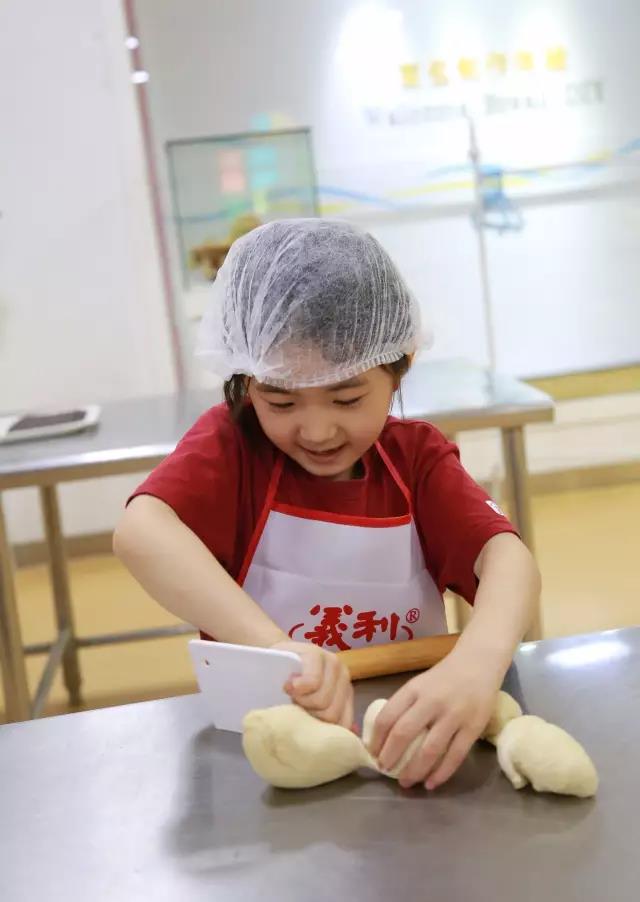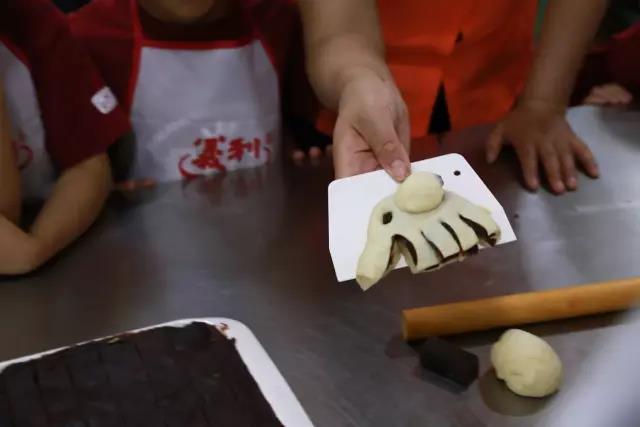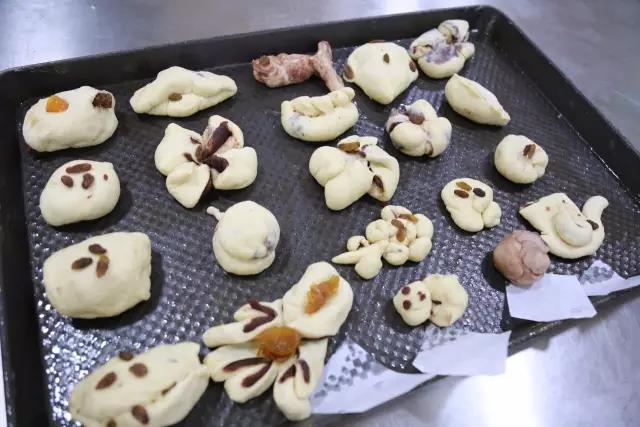 每一个操作台上,都有一份准备好的面包馅料,包括葡萄干和豆沙,每人250克重的面团。师傅先教大家制作3款面包,有毛毛虫、小花、羊角包,在熟悉了大致流程后,孩子们就可以DIY自己想要的造型啦。