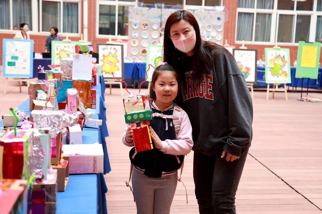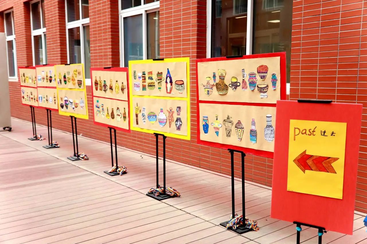 本次成果展,结合了国内义务教育美术课程标准和IB-PYP的指导要求,融合了“过去”(彩陶文化、船的发展),“现在”(创新设计的瓶子、创意绘画、现代交通工具的设计),以及“未来”(科技探索的梦想),展示了小学部PYP学生对时间、文化、科技的理解和表达。