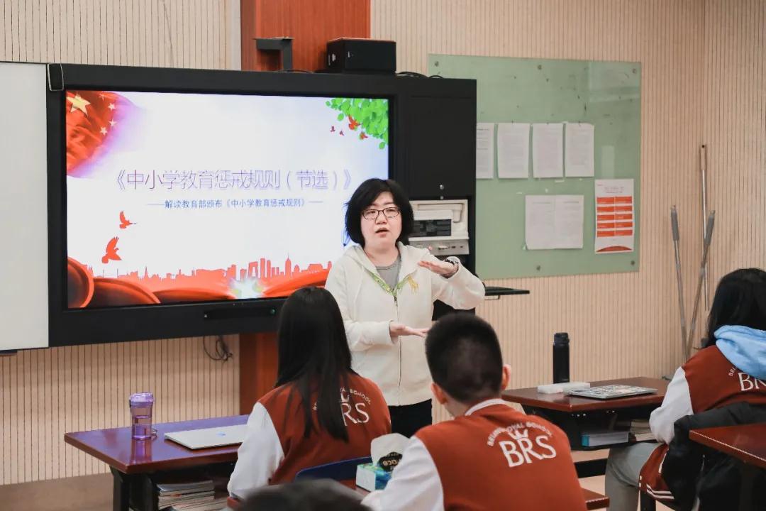 为将教育惩戒政策纳入校园管理范畴,更好地推动学校全面贯彻落实党的教育方针和立德树人的根本任务,3月5日,王府高中各年级通过班会的形式,宣讲和解读教育部颁布的《中小学教育惩戒规则(试行)》,学校以实际行动,积极推进落实,普及政策内容及思想内涵,规范学生行为,力争从点滴做起,逐步落实,不断深化,持续提升学校教育管理能力和依法治教水平。(图| 毛岸彬)On March 5th, all grades of BRS publicized and interpreted the “Disciplinary Rules of Primary and Secondary Education” issued by the Ministry of Education through class meeting. In this way, BRS actively promoted the implementation, popularized the content and ideological connotation of the education policy, and standardized students’ behavior. This brings students disciplinary education policy into the scope of campus management and better promotes our school to fully implement the Party’s education policy and the fundamental task of cultivating students by virtue. BRS strives to gradually implement, constantly deepen, and continued to improve the campus education management ability and the teaching level according to law.
