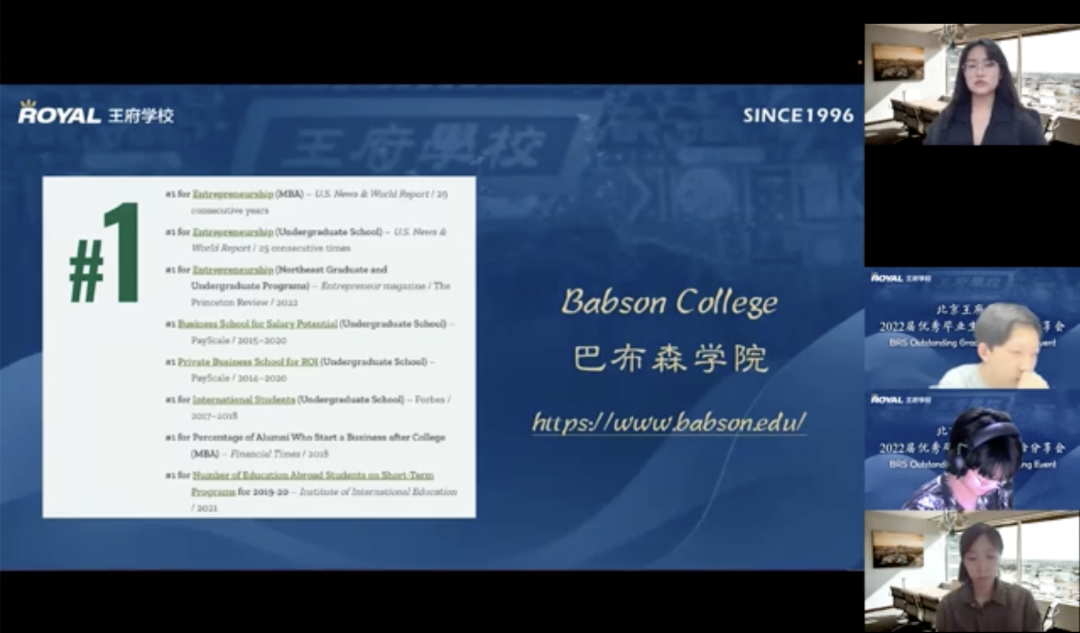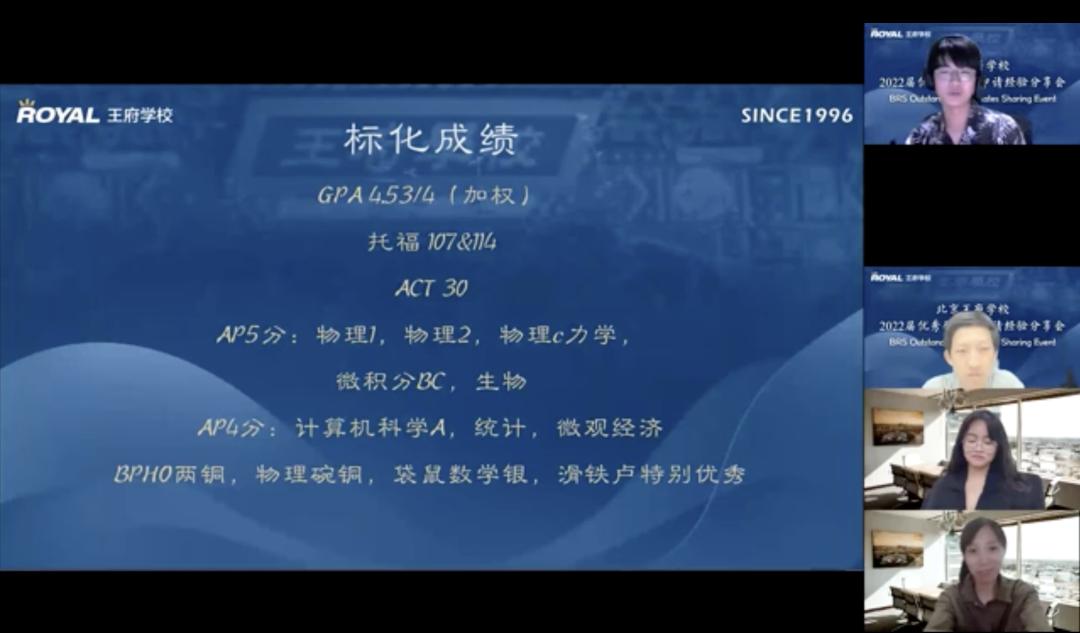 Gan Jiaxin and Hu Jingwen, outstanding graduates of the class of 2022 from Beijing Royal School, shared their college application experience with students online on June 19. Two students around “to apply for university preparation, how to choose the school, how to improve the standardized scores and language achievement, how to prepare application documents, how to choose the student activities” on topics such as the comprehensive introduction, also reminded students to pay attention to the college application time node, and hope for future graduates to receive offers from their dream universities in the future.