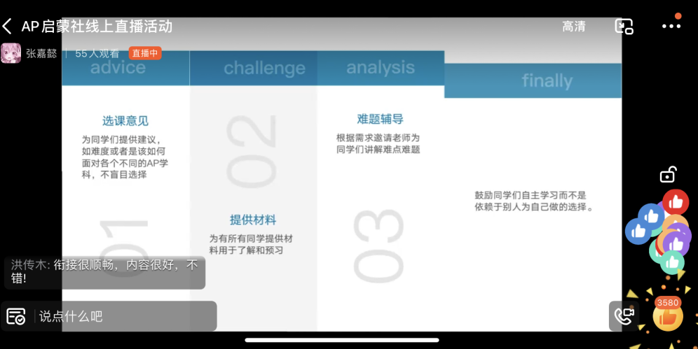 6月16日晚,北京王府学校AP启蒙社团在线上为同学们带来了一场围绕AP课程的主题直播活动。社团社长张嘉懿同学、副社长张超同学首先分享了如何选择适合自己的AP课程进行学习,并针对AP生物、环境科学、微观经济和宏观经济这四个学科的课程内容设置、学科难点、考试形式以及备考建议等内容进行了详细的讲解,并向同学们介绍了AP启蒙社可以提供的关于学习AP及考试方面的帮助。