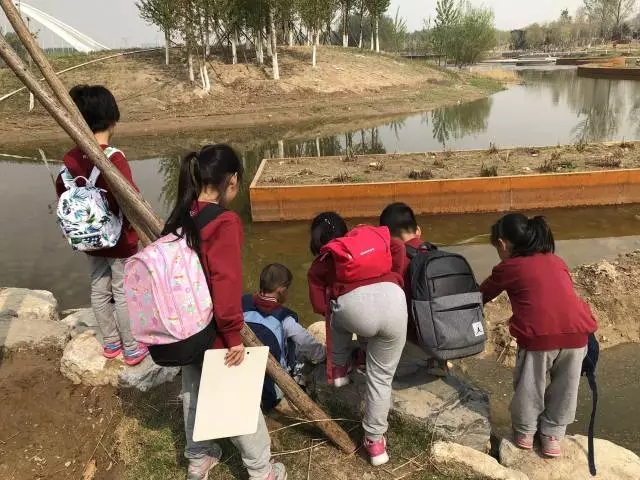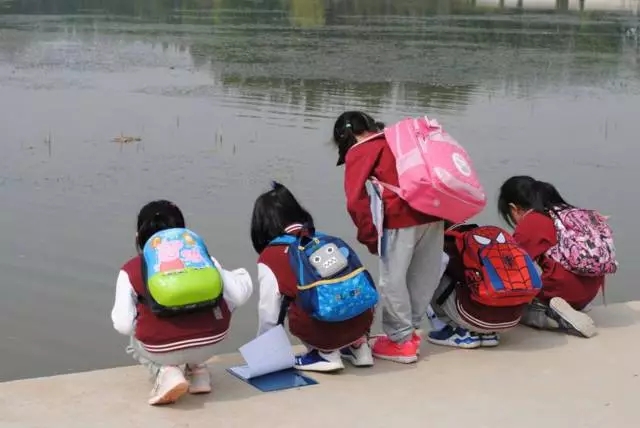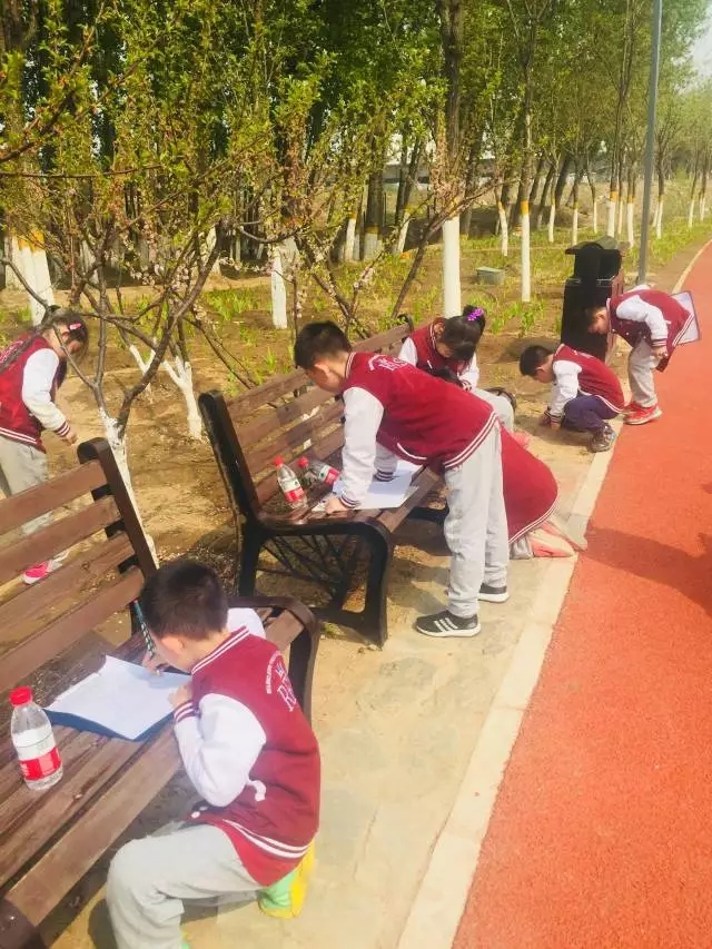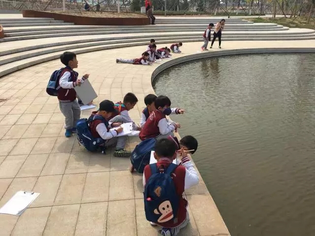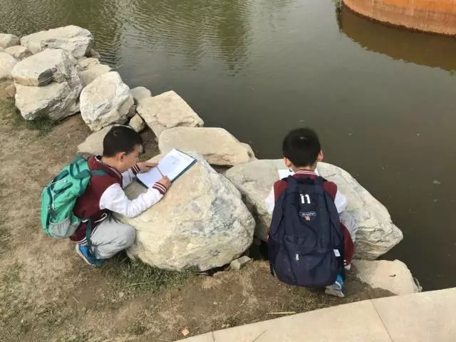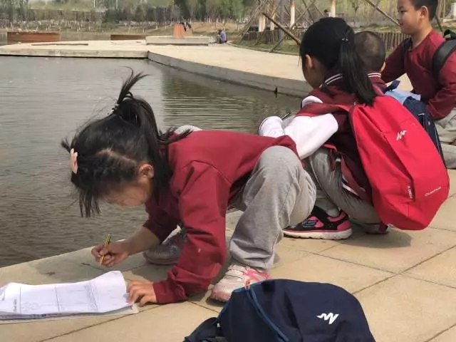 有徜徉在水草中的快活鱼儿,有嬉戏在芦苇丛中的调皮野鸭,有飞舞在花田里的斑斓彩蝶,有跳跃在树林间的勤劳喜鹊。孩子们兴高采烈地与伙伴们分享着新遇见的朋友。一个个瞪大了眼睛,小心翼翼地观察着。他们耐心的记录下这些可爱的小家伙们的栖息地。石凳,台阶,地砖都成了他们的书桌。看这认真的表情,连路边的花儿都在为他们点赞呢。