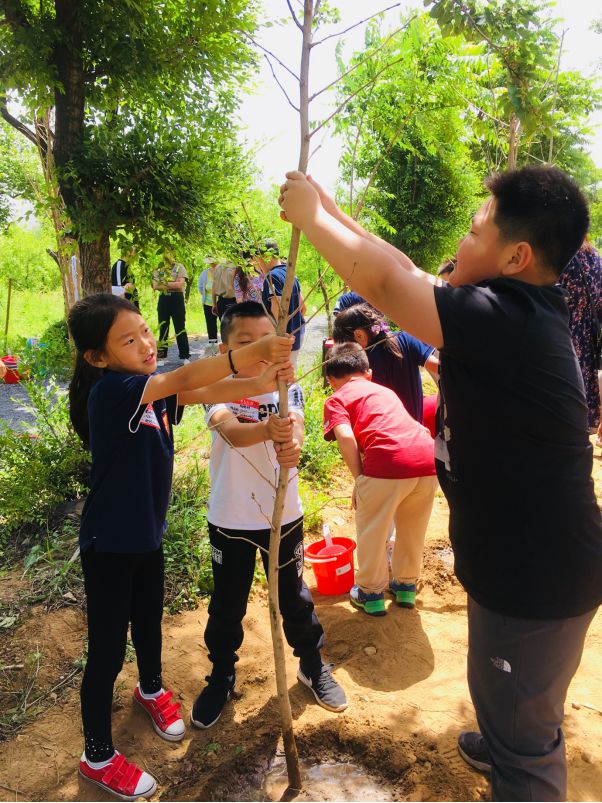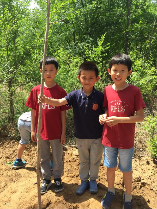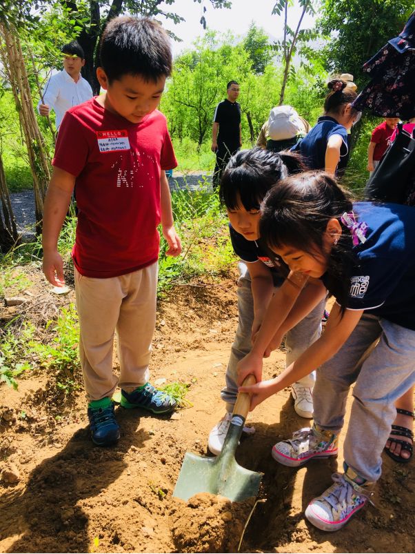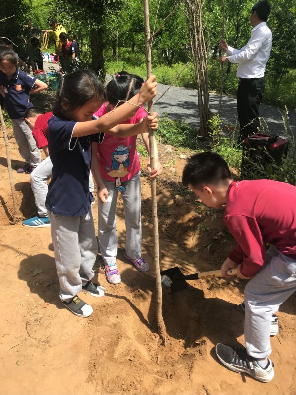 当我们到达种植区域时,教官简单的介绍了一些指令。孩子们开始轮流用铲子挖树坑。接着他们学会了当挖的洞越深越宽时,就越能更好的支撑小树苗。然后他们小心翼翼地把树苗放进去,再用泥土盖住树坑,把土压平,给他们的新生小“婴儿”浇水。最后每个孩子把手放到了小树苗上并许下愿望,希望小树健康长大。