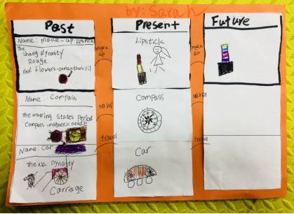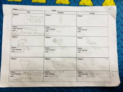 To follow up our visit to the museum, we began working on a small poster that focuses on three artifacts from the trip. Our students chose the three artifacts that triggered their curiosity the most, and they explored what the artifact looks like in present-day. Our students used this poster to make connections between their items’ past and present states: