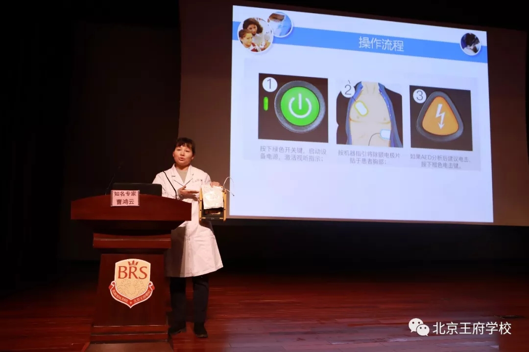 On March 19, BRS was honored to have Ms. Cao Hongyun, Deputy Chief Physician and Director of the Emergency Department of Beijing Royal Integrative Medicine Hospital, to our school to conduct a lecture on cardiopulmonary resuscitation and how to properly use the Automated External Defibrillator (AED). BRS added an AED this spring in the corridor of our campus’ gym and offered this life-saving instructive course in order to protect the health and safety of our students and staff in the case of medical emergency.