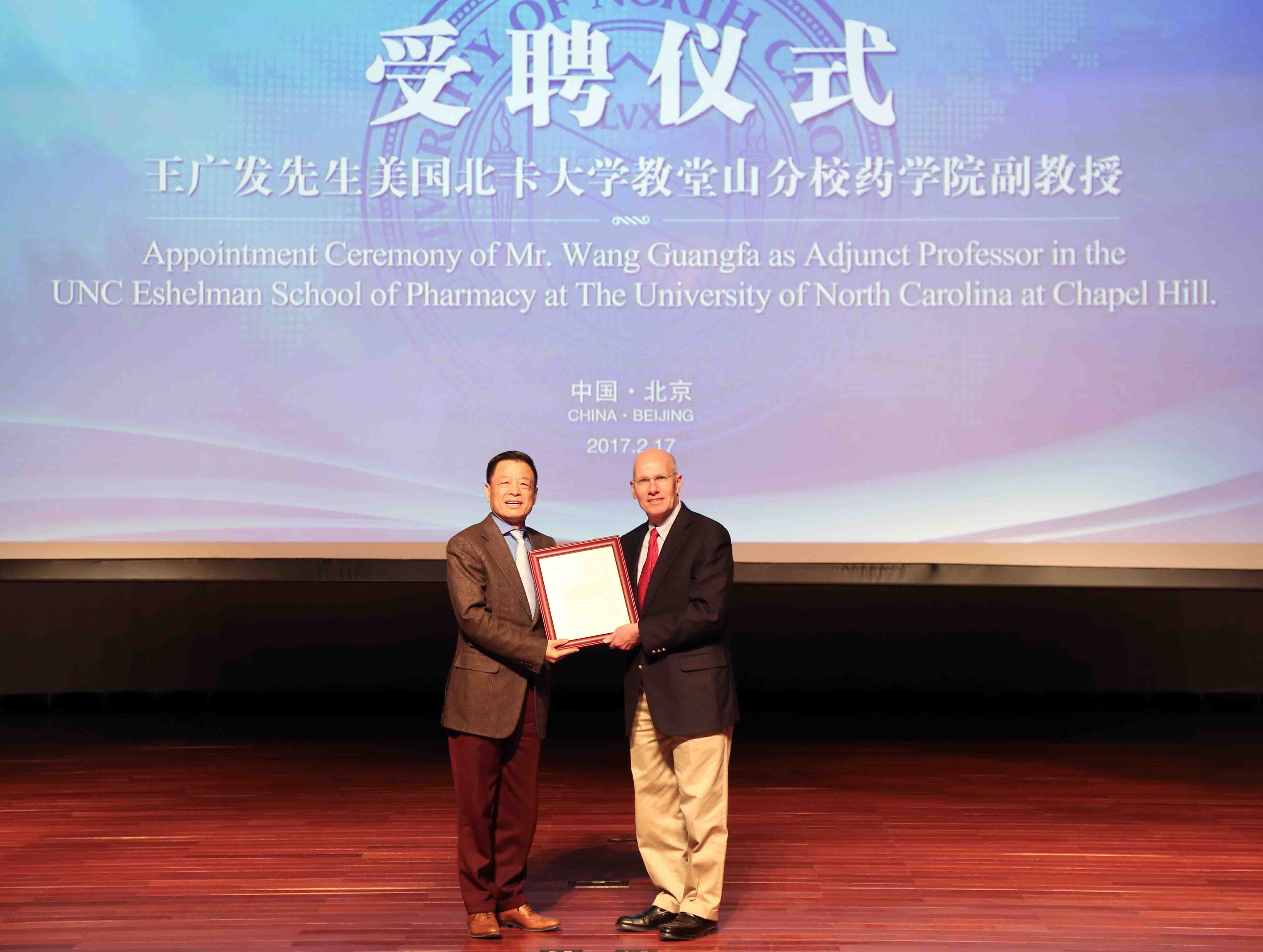 On February 17, 2017, the Appointment Ceremony of Mr. Wang Guangfa as Adjunct Professor in the UNC Eshelman School of Pharmacy was held at BRS main auditorium. Robert Blouin, the dean of the UNC Eshelman School of Pharmacy, awarded to Principal Wang Guangfa.