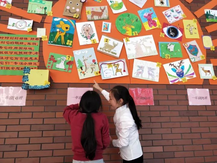 There were about 90 student projects, some of which were selected and hung on the wall of the first building to be displayed. Many visitors were invited to vote on these drawings. Even our dear and beloved Principal Ren and our older brothers and sisters from the middle school came!